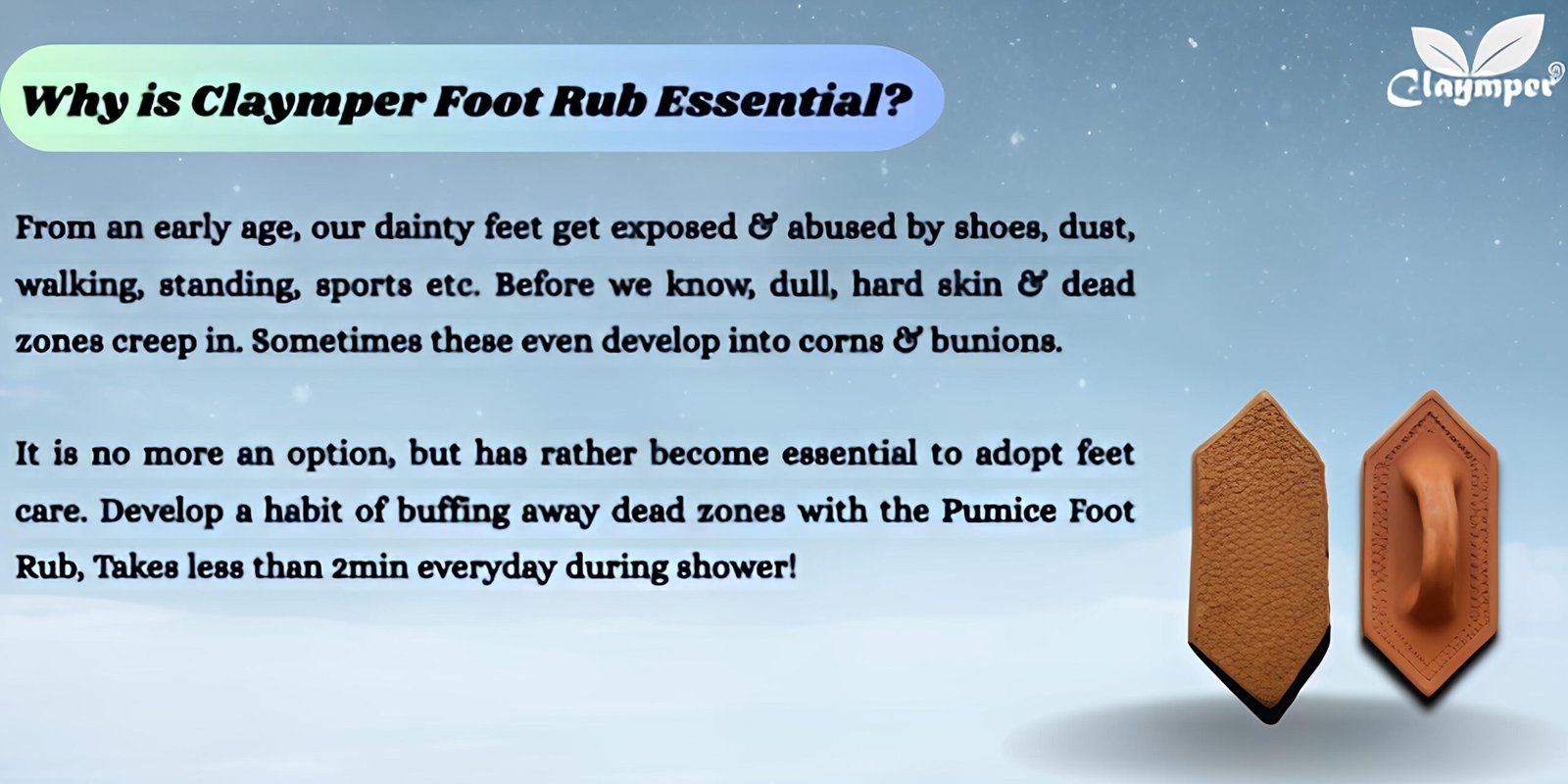 - Eco-Friendly and Sustainable: At Claymper, we are committed to sustainability. Our foot scrubber is an eco-friendly choice, as it is made from natural clay and does not contribute to plastic waste. Join us in caring for the environment while caring for your skin.
